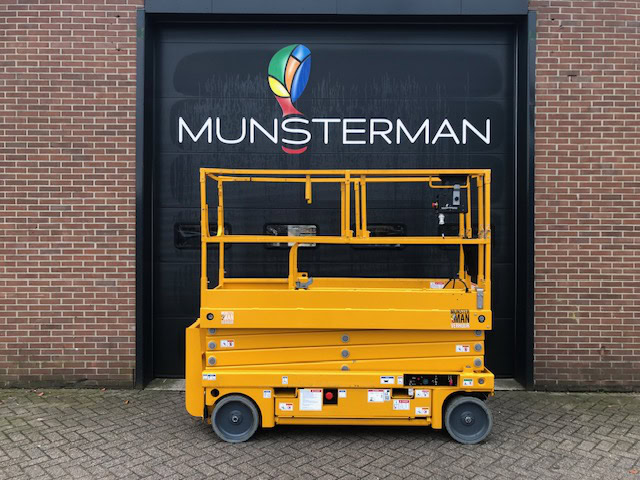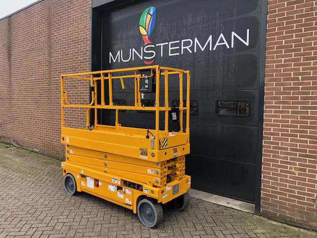 Een elektrische schaarhoogwerker met een werkhoogte van 10 meter en 81cm breed.