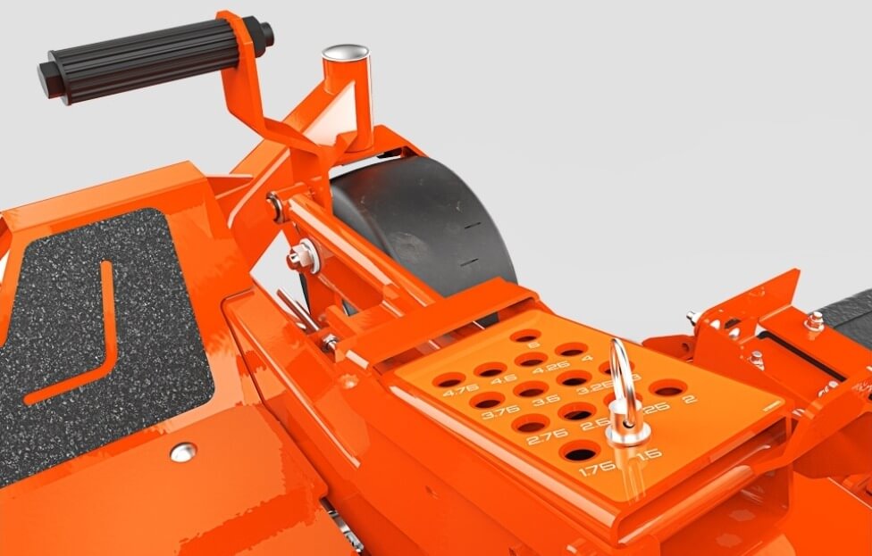 - Instelbaarheid: De maaihoogte is in 15 posities instelbaar van 3,8 cm tot 12,7 cm via een handig voetbediend liftsysteem.