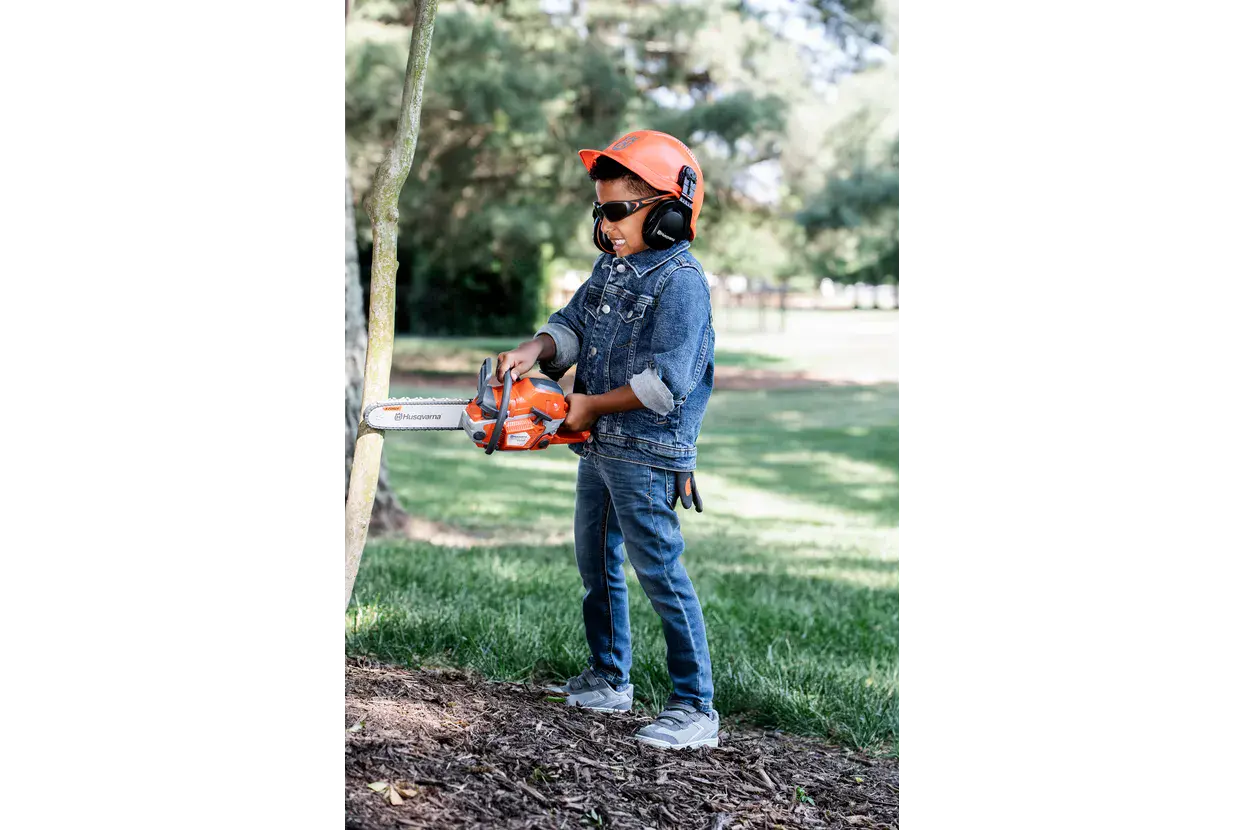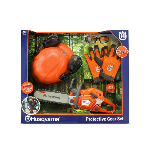Ziet eruit als een echte Husqvarna 550XP kettingzaag met extra veiligheidsuitrusting voor kinderen! De speelgoedkettingzaag is geschikt voor kinderen vanaf 3 jaar. Beschikt over een realistisch kettingzaaggeluid en draaiende ketting.