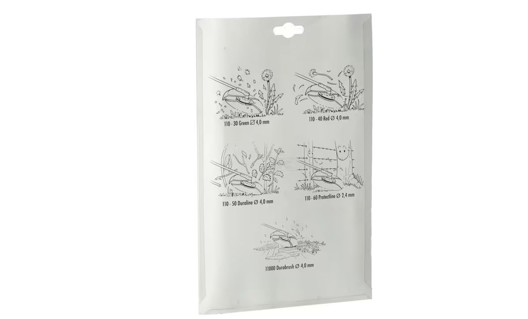 - Blisterverpakking met maaikop, diverse maaidraden en rode beschermingsdop
